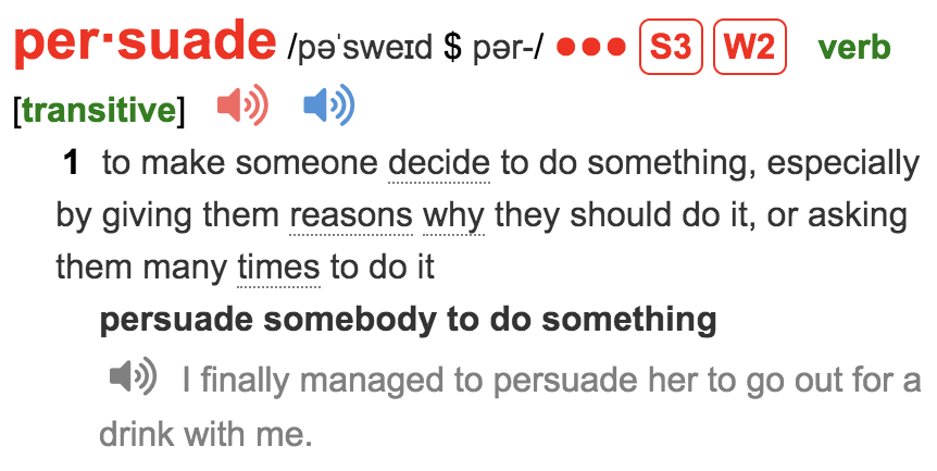 persuadeを英和辞典で引くと「説得する」。でも、英英辞典を引くと、「to make someone decide to do something, especially by giving them reasons why they should do it, or asking them many times to do it」と英語で出ている。